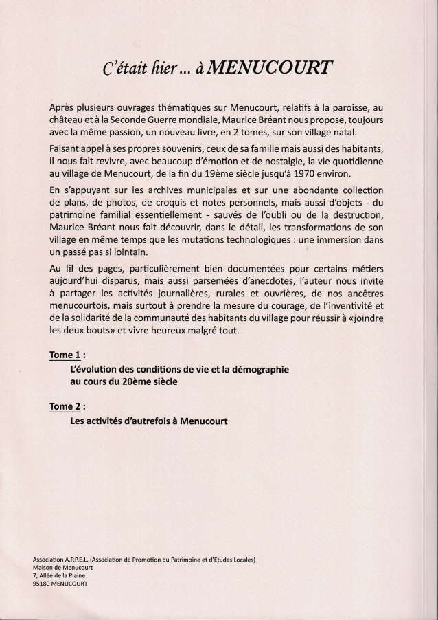 Et aussi dans ce livre : plan de Menucourt 1879, plan de l'ancienne place de l'église (église, cimetière, Mairie-école), plan de l'école, anciennes et nouvelles rues, les maisons, l'eau, la cité Saint-Léger, la cité Saint-Paul, le "trou à glaise".